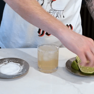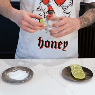 Run a lime wedge round the rim of a rocks glass so that the salt sticks to the rim.