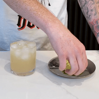 Run a lime wedge round the rim of a rocks glass so that the salt sticks to the rim.